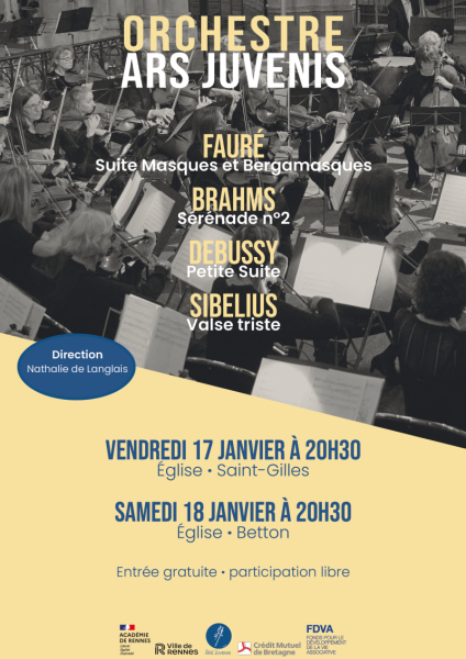 Découvrez la saison 2024–2025 de l’Orchestre Ars Juvenis : une année musicale riche en émotions, entre chefs-d’œuvre du répertoire classique et œuvres rares à redécouvrir. De Beethoven à Fauré, de Debussy à von Suppé, nos concerts à Rennes et en Ille-et-Vilaine vous invitent à un voyage sonore varié et inspirant. Rejoignez-nous pour vivre la musique classique autrement, portée par la passion de musiciens engagés.